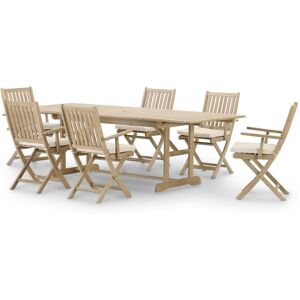 Pack de 8 chaises pliantes en bois d’acacia avec accoudoirs. La finition du bois est dans un ton clair. Mesure 41x56x89cm. Poids 5 kg\nTable de jardin extensible en bois d’acacia de couleur claire. Fabriqué en bois d’acacia certifié FSC (garantie de forêts bien gérées sur le plan environnemental et social). Mesures fermées table 180x100x74.5. Mesures table étendue 240x100x74,5cm. Poids 38,5kg