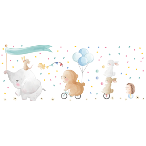Sticker occultant pour vos fenêtres et votre salle de bain! Ce sticker représente un éléphant avec un drapeau, une sourie avec les maracas, un oiseau avec un ruban, un ourson sur un vélo, deux lapins sur un monocycle, un hérisson et des confettis. Ce sticker occultant et privatif pour fenêtre mesur
