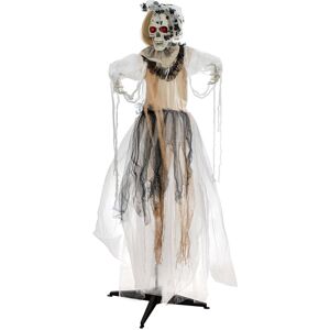 La mariée oubliée hante sans repos comme un fantôme et cherche toujours son mari disparu. Effrayez vos invités avec cette figurine fantôme plutôt inhabituelle ! La figurine décorative animée porte toujours sa magnifique robe de mariée et ses cheveux sont retenus par un ruban. Mais où est donc le marié pour lequel elle s'est mise sur son trente-et-un ? Tandis qu'elle lève désespérément les bras au ciel pour déplorer l'absence de son futur mari d'une voix larmoyante, sa tête tourne dans tous les sens et des LED rouges clignotent dans ses yeux. Ne manque-t-elle vraiment aucun détail ? L'animation de la figurine décorative peut être activée via un microphone intégré, le bouton « Step here » ou une commande manuelle filaire. La figurine d'Halloween peut être alimentée par piles, par un câble USB-A pour un fonctionnement en 5 V via une batterie externe ou un adaptateur secteur.Figurine animée avec effets lumineux et sonores (fonctionnement sur piles et USB) Effets sonores, Yeux rouges clignotants, Arms avec effet de mouvement, Tête avec effet de mouvement, Durée de l'animation jusqu'à 25 secondes, Rangement peu encombrant, Facile à assembler, Alimenté par une batterie/un bloc-batterie, Bras malléables, Contenu de l'emballage 1 x pédale de commande, 1 x figurine, 1 x manuel d'utilisation, 1 x support, Alimentation électrique: 4,5 V CCOu5 V CC, Classification IP: IP20, Connexion électrique: Batterie/bloc-batterieCordon d'alimentation pour connexion USB A sur secteur (fourni), Batterie: 3 piles Mignon (AA) (non incluses), Effet: Effets sonores, yeux rouges clignotants, bras avec effet de mouvement, tête avec effet de mouvement, via capteur acoustique ou boutonDurée jusqu'à 25 secondes, Position debout/fixation: Stand, Configuration: Rangement peu encombrant, facile à assembler, bras modulables, Saison: Halloween, Dimensions: Longueur: 50 cmLargeur: 80 cmHauteur: 170 cm, Poids: 1,45 kg