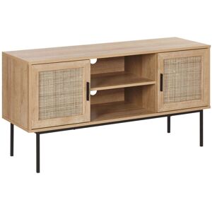 Cette banquette télé avec ses 2 portes à cannage en rotin naturel saura se faire remarquer et apporter une grande dose de style bohème à votre salon ou chambre. N'hésitez pas à la placer dans un endroit bien exposé de votre séjour ou encore d’y ajouter des plantes vertes. Pas moins pratique qu’élégant, ce meuble TV vous offre 2 compartiments de rangement spacieux ainsi qu'une étagère pour votre décodeur et lecteur DVD (trous passe-câbles inclus). Les pieds en métal noir, de leur côté, ajoutent une touche industrielle à l’ensemble et assurent robustesse et longévité.