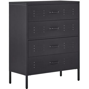 Armoire de rangement en acier. Cette armoire fonctionnelle conçue dans un style industriel est dotée de quatre tiroirs. Le corps est en métal robuste, ce qui le rend particulièrement pérenne. La haute qualité de son revêtement électrostatique en poudre rend les surfaces faciles à entretenir et augmente la résistance du meuble face à la corrosion. Grâce à son look minimaliste, cet armoire sera un merveilleux ajout à une chambre à coucher ou à votre bureau.Détails: Type de produit: Armoire de bureau Style: Moderne Couleur principale: Noir Type de matière: Métal Matière principale: Acier Matière du piétement: Métal Tiroirs: Oui Finition: Revêtement par électrodéposition Verrouillable à clé: Non Nombre de tiroirs: 4 Étagères: Non Dimensions: Profondeur: 40 cm Largeur: 80 cm Hauteur: 102 cm Poids: 30 kg Charge maximum du tiroir: 15/20/25 kg Charge admise du plateau: 50 kg L`offre inclue: 1 x Commode Caractéristiques clés: Tiroirs à système de fermeture amortie. Parfait pour un intérieur industriel, Facile à entretenir et extrêmement durable, Idéal pour un espace de travail, Des patins pour les pieds assurent la protection contre les rayures, Les fentes de ventilation permettent le renouvellement de l'air Informations d`assemblage: À assembler entièrement. 45 - 60 min Conseils de maintenance: Acier: 1.Nettoyez avec un chiffon et un détergent doux, essuyez bien ensuite 2.Pour éviter les rayures, n'utilisez pas de nettoyants abrasifs 3.Pour les éléments en cuivre ou chromés, utilisez un produit de polissage spécial.