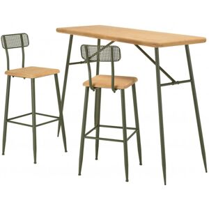 Ensemble 1 bar + 2 tabourets pin et métal vert. Article en Pin/Acier. Dimension bar : 153 x 50 x 103.5 cm/tabouret : 40 x 45 x 101.5 cm/tabouret : 40 x 45 x 101.5 cm. Recevez vos invités avec cet ensemble de bar, comprenant un bar et deux tabourets au design unique ! L'alliance du pin naturel et du métal vert apporte une touche à la fois moderne et chaleureuse, idéale pour des moments conviviaux.