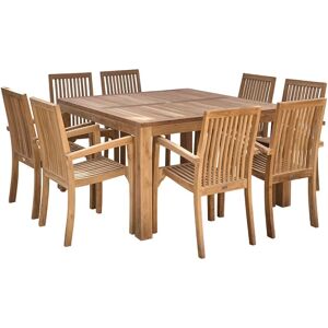 Les beaux jours donnent envie de se prélasser et profiter de moments en extérieur. Cet ensemble de jardin composé d'une jolie table carrée aux lignes droites et pieds biseautés ainsi que de deux chaises en teck massif de la même collection offre cette possibilité, même dans les petits extérieurs tels que les balcons ou jardins. Caractéristiques : Matière : Teck - Couleur : Naturel – Hauteur : 75 cm - Longueur : 80 cm - Largeur 80 cm - Poids : 26,5 kg - Garantie : 5 ans - Montage : Pieds à assembler.