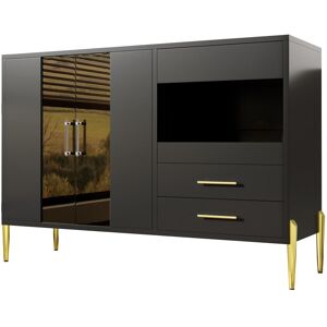 Buffet noir luxueux une niche, 3 tirioirs et 1 porte verre teinté poignées et pieds dorés QELGUKSCe buffet ODIKALO arbore une esthétique moderne avec sa finition noire brillante et ses pieds élégants de couleur dorée. Il offre une solution de rangement polyvalente avec deux portes, dont l'une présente un panneau miroir, suggérant des étagères à l'intérieur. Sur la droite, deux tiroirs dotés de poignées dorées minimalistes fournissent un espace de rangement discret supplémentaire. Les lignes épurées et les accents métalliques contrastants confèrent à ce buffet une allure sophistiquée et contemporaine, en faisant un ajout élégant à tout espace de vie ou salle à manger. Taille du produit : 120*39,5*84 cm, équipé de cloisons réglables de haut en bas bien conçues, adaptées au stockage d'articles de différentes hauteurs, rendant le stockage plus humain et l'utilisation de l'espace plus efficace.Conception d'apparence : coins arrondis élégants, adieu aux angles tranchants, sûrs et beaux. Porte d'armoire à rayures verticales au sens tridimensionnel unique, avec un ton blanc frais, pour l'espace injecté dans le dynamique et la mode, adapté à une variété de styles de décoration intérieure.Fonction pratique : 2 portes d'armoire, 3 tiroirs, 1 compartiment de rangement ouvert, séparateurs réglables, beaucoup d'espace de rangement, catégorisable pour ranger les ustensiles, les couverts, etc., afin que la vie soit bien organisée et que les problèmes de stockage soient facilement résolus.Assurance qualité : sélection de plaques de haute qualité, résistantes à l'usure et durables, faciles à nettoyer et à entretenir. Conception structurelle stable, pas facile à déformer pour une utilisation longue durée, compagnon de votre vie à la maison. Caractéristiques :Matériel : MDF + verre, métalDimensions du produit :Largeur : 120 cmProfondeur : 39.50 cmHauteur : 84 cm Dimensions du colis 2 colis :135.26 * 48.26 * 15.49 cm84.46 * 46.48 * 16 cmPoids net/brut 36.90/40.90 kgGarantie :2 ans (voir politique de garantie) Remarque :-Le produit sera envoyé depuis dépôt en Allemagne, la livraison prendra environ 7-10 jours ouvrés pour recevoir. -Veuillez mesurer votre espace et la taille avant d'acheter. Merci pour votre compréhension!-Le produit sera envoyé depuis l'Allemagne en 2 colis, parfois les colis arrivent à des dates différentes, veuillez-vous assurer d'avoir reçu 2 colis avant de l'assembler !