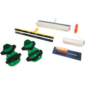Le set de nivellement universel HBM 5 pièces est idéal pour appliquer des produits autolissants. Il comprend un grand rouleau à pointes (500 mm) et un petit (250 mm), tous deux avec des pointes de 28 mm pour ventiler efficacement la surface. Les chaussures à pointes (300 x 130 mm) permettent de se déplacer en toute sécurité sur un sol humide. Le râteau de nivellement de 560 mm avec deux types de dents (3 x 4 mm et 5 x 4 mm) assure une répartition uniforme. Enfin, le disque à colle de 300 x 110 mm facilite l'application de la colle.