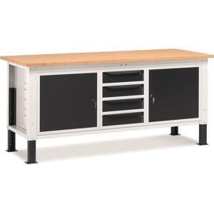 Etabli métallique Fortis n°8 avec plateau bois en multipli hêtre épaisseur 30 mm Structure fabriquée en tôle d’acier de première qualité Plateau supportant une charge de 1000 kg (C.U.R) > Pieds réglables en hauteur de 732 à 1107 mm (au pas de vis de 25 mm) > 2 blocs 1 porte H.490 mm avec 1 tablette réglable en hauteur - Dim. hors-tout blocs : L.629*P.607*H.570 mm > 1 bloc 4 tiroirs H.105 mm (dim.utile H.92 mm), extens