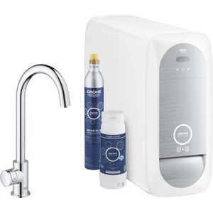 Grohe Blue Home Kit de démarrage avec système de filtration de l'eau Ref.: 31498DC1 Bouton pour 3 types d'eau : pétillante, fines bulles et plate Eau filtrée réfrigérée, plate, fines bulles, pétillante Mitigeur bec C Monotrou sur plage GROHE StarLight éclatant et durable GROHE Blue Home unité réfrigérante Délivre 3 litres d'eau réfrigérée par heure 180 Watt, 230 V, 50 Hz Protection de type IP 21 Nécessite des trous d'aération dans le meuble de cuisine Configuration et surveillance de la capacité du filtre et de la bouteille de C0² à partir de l’application GROHE Ondus App Avec interfaces Bluetooth 4.0* et WIFI pour une communication des données sans fil Pour Apple** et Android La portée Bluetooth (10 m) change selon les dispositifs utilisés et les murs entre émetteur et recepteur Ajustable pour le filtre GROHE BLUE taille S; le filtre à charbon actif et le filtre magnésium Filtre GROHE Blue taille S et tête de filtre avec languette pour l'ajustement de la dureté de l'eau Pour les régions avec une dureté de l'eau en dessous de 9° TH, veuillez commander le filtre au charbon actif 40547001 GROHE Blue bouteilles de CO2 de 425 g