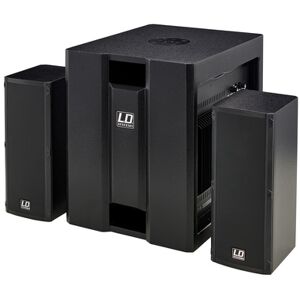 "LD Systems Dave 8 Roadie, Système de sonorisation/média compact, Caisson de basse passe-bande actif avec 1 haut-parleur 8"" et deux enceintes satellites de 2x 4"" avec moteur de compression 1"" Appolito, Puissance du système: 150 W RMS (caisson de basse) et 2x 100 W RMS (enceinte satellite), Réponse en fréquence: 45 - 19 000 Hz, Niveau de pression acoustique max.: 117 dB, Limiteur intégré, Mixer 3 canaux intégré avec connecteurs XLR/Jack, Entrée sur mini Jack stéréo et RCA, Sortie sur Speaker Twist, Inversion de phase à 180°, Admission de 16 mm, Dimensions du caisson de basse: 352 x 430 x 434 mm, Poids du caisson de basse: 18 kg, Dimensions d'une enceinte satellite: : 144 x 350 x 170 mm, Poids d'une enceinte satellite: 4,5 kg, Couleur: Noir, Câble d'alimentation incl., Trépied adapté #328916# ou #398997# optionnel non fourni"