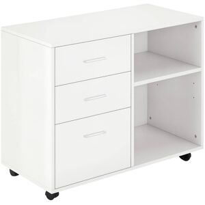 Description:Optimisez l'organisation de vos affaires de bureau à la maison ou au travail avec ce superbe support à imprimante sur roulettes multi-rangements. Equipé de 3 tiroirs, de 2 niches et d'un grand plateau, vous pourrez y ranger tout votre matériel d'impression et accessoires (imprimante, feuilles, stylos, feutres, ciseaux, cahiers, trombones, courrier, etc…).caractéristique:● Support d'imprimante sur roulettes pivotantes à 360° dont 2 équipées de frein : idéal à déplacer facilement (roulette supplémentaire, stabilité et mobilité optimale) et à stopper; ● Organisateur de bureau équipé de 3 tiroirs, de 2 niches et d'un grand plateau, vous pourrez y ranger tout votre matériel d'impression et accessoires; ● Etagère réglable en hauteur à 3 niveaux; ● Conçu et fabriqué en panneaux de particules E1 épaisseur 1,5 cm robustes : usage pérenne; ● Assemblage facile et rapide (manuel d'assemblage illustré fourni);Spécification:● Couleur : blanc; ● Matériau principal : panneaux de particules classe E1; ● Dim. totales : 80L x 40l x 65H cm; ● Dim. interne du grand tiroir : 32L x 28,5l x 13H cm; ● Dim. interne des petits tiroirs : 32L x 28,5l x 8H cm; ● Dim. étagères : 37L x 37,5l x 27,5H cm; ● Hauteur réglable de l'étagère : 6,4 cm; ● Charge max. recommandée : 60 Kg; ● Livraison effectuée en un colis; ● Réf. : 924-013WTcontenu du colis: