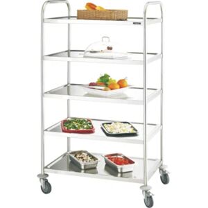 Chariot inox à 2 ou 3 étagères en acier inoxydable 201. 4 roues directionnelles dont 2 avec frein. Charge utile de 120 kg. Dimensions Ext. : 920 x 600 x 945 mm. Dimensions des plateaux : 830 x 510 mm. Distance entre les plateaux : 275 ou 570 mm selon la référence. Livré en kit, montage facile. ...