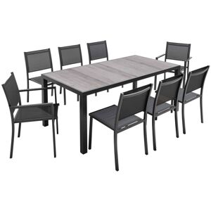 Élégant et pratique avec son système de rallonge papillon, le salon de jardin extensible Samba promet des repas conviviaux entre amis ou en famille. Il comprend une grande table avec rallonge et 8 chaises, avec un design pensé pour l'extérieur. La table extensible peut accueillir jusqu'à 8 convives une fois rallongée : le plateau central se déplie en un seul geste et vous permet d'adapter votre salon à l'envie. La structure de l'ensemble est en aluminium gris, à la fois léger et robuste : le salon de jardin Samba ne craint pas la rouille et ne requiert pratiquement aucun entretien. L'assise et le dossier des chaises sont en textilène, matériau ultra résistant mais aussi souple et confortable. Les chaises de jardin sont empilables et peu encombrantes une fois rangées. Seuls les pieds de la table sont à assembler, la notice et la visserie sont fournies. Table de jardin Dimensions table: Longueur 145 x largeur 100/145 x hauteur 74 cm. Chaise de jardin Largeur 48 cm x Profondeur 55 cm x Hauteur 87 cm. Hauteur de l'assise 45 cm. Assise: largeur 41 x Profondeur 46 cm.