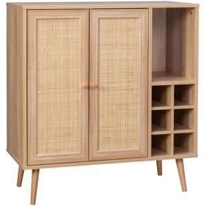 Les + produit :6 casiers à bouteilles2 étagèresPortes en cannageAvec son cannage et son décor bois, ce meuble range bouteilles saura vous séduire par son authenticité, son élégance et ses lignes épurées. Son côté rétro, renforcé par ses 4 pieds compas scandinaves, s'intégrera bien à tout type de salle à manger. Fonctionnel, il vous permettra de mettre en valeur les bouteilles dont vous êtes les plus fiers dans les 7 casiers disponibles, et même de disposer quelques verres ou éléments de déco sur le plateau. Buffet : L 83 x P 39 x H 88,5cmPlateau : L 83 x l 39cmEpaisseur des panneaux : 1,5cmEtagères : L 56,5 x P 34,5cmHauteur entre les étagères : 33,5cmNiche : L 21,5 x P 36,5 x H 34cmCasiers bouteilles: 10x10cm (x6)Hauteur des pieds : 17cmPoids net : 24,kgPoids max supporté total : 30kgPoids max supporté par le plateau : 10kgPoids max supporté par étagère : 5kg