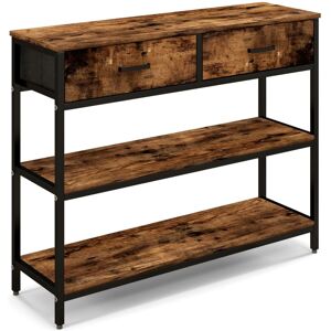 Attributs:Style industriel: Le grain de bois brun foncé distinctif présente un charme industriel et complète magnifiquement la structure métallique noire, qui peut être utilisée dans une variété de scénarios et offre une vue lumineuse.Espace de rangement suffisant: Cette table d'entrée est dotée d'un large plateau permettant d'exposer proprement vos livres ou œuvres d'art. De plus, la table console comprend 2 étagères ouvertes pour un espace de rangement supplémentaire. Sa construction compacte lui permet de s'adapter au salon, à l'entrée, à la chambre, etc.Construction robuste: Grâce à sa structure en métal de qualité, cette table d'entrée offre une bonne solidité. De plus, chaque pied est équipé de patins réglables, ce qui permet d'assurer une meilleure stabilité sur les sols irréguliers et d'éviter les rayures accidentelles sur le sol.Tiroirs en tissu rabattables: Cette table console est équipée de 2 tiroirs en tissu rabattables qui offrent un espace privé pour les objets personnels ou les documents importants. Les 2 tiroirs sont faciles à mettre en place, et vous pouvez les plier pour les ranger lorsqu'ils ne sont pas utilisés.Conception anti-basculement: Notre table console comprend 2 kits anti-basculement très résistants. Ainsi, la table console repose fermement contre le mur, ce qui évite parfaitement les basculements et assure votre sécurité.Specifications:Couleur: Marron rustiqueMatériau: Métal, Bois d’ingénierieDimension totale: 100 x 30 x 80 cm (L x l x H)Taille intérieure du tiroir: 45 x 29 x 13 cm (L x l x H)Taille de chaque étagère: 99 x 29 cm (L x l)Capacité de charge de la table: 30 kgCapacité de charge de chaque tiroir: 5 kgCapacité de charge de chaque étagère: 30 kgPoids net: 16kgLe colis comprend:1 x Table console1 x Instructions