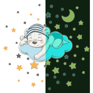Des stickers phosphorescents pour votre déco ! Avec les stickers muraux phosphorescents et ce Stickers phosphorescents ourson rêveur et 50 étoiles, vous vous approprierez enfin votre intérieur ! Dimensions des Stickers phosphorescents ourson rêveur et 50 étoiles : Une planche de 30 x 35 cm, le stic