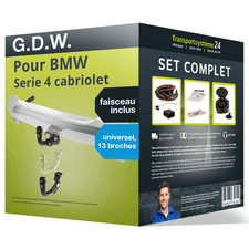 Reconnue mondialement, Brink est une des marques leader sur le marché de l’attelage. Pratiques et faciles à monter, les produits Brink sont fabriqués en France et aux Pays-Bas pour garantir un haut niveau de qualité. Facile à monter grâce à la notice de montage fournie (partie mécanique). Caractéristiques : Indications : BMW Serie 4 F33 Cabriolet - sauf modèles avec Pack M, M4 et Active Hybride Date de fabrication : 09/13- Type de rotule : Col de cygne démontable avec outil Masse remorquable : 1700Kg Masse statique : 75Kg Dépose du pare-chocs : Oui Découpe du pare-chocs : Découpe non-visible (sous le pare-chocs) Poids de l'attelage : 13.6Kg Caractéristiques du faisceau : Type : Faisceau universel multiplexé 7 broches avec boitier électroni que pour protéger l'ordinateur de bord du véhicule Longueur des fils : 3m de fils p our le montage du module, 5m de longueur pour le fil d'alimentation Cosse : Pré-montée sur le connecteur du boitier électronique Passage à la valise : Non Gestion des radars de recul : Non, désactivation manuelle via interrupteur au tableau de bord (si le véhicule en est pourvu)