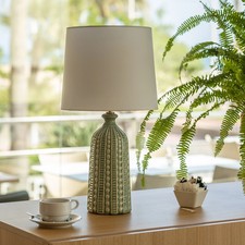 Dimensions• H 18,5 x Ø 8,5 cmComposition• Pied en céramique• Globe en verreDescription• Pied en céramique reliefé, rayé blanc et taupe • Abat-jour globe en verre • Interrupteur ON/OFF sous le pied de la lampe• Ampoule LED fournie• Fonctionne avec 2 piles AAA / LR03