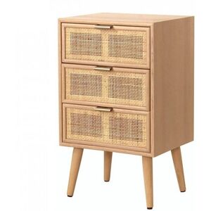 Compacte et pratique, notre petite commode 3 tiroirs façade rotin créera un espace de rangement supplémentaire dans n'importe quelle pièce de la maison.Il est idéal pour venir y stocker vos petites affaires et peut être utilisé comme table de chevet, petit meuble de salle de bain, rangement ou table d'appoint dans le salon.Composé d'une structure en MDF, de pieds en sapin et recouvert de placage en bois de Frêne, cette commode dispose de 3 tiroirs aux façades en rotin naturel finit de poignées en acier coloris or.Matière : MDF & placage en bois de Frêne. Cannage en rotin véritable, poignées peinture dorée. Pieds en sapin. Caractéristiques :Trois tiroirs - poignées métal peinture doréeCannage rotin naturelTiroirs équipés de coulisses métalliquesMeuble à monter soi-mêmeDimensions : H 71 cm x L 42 cm x P 36.5 cm