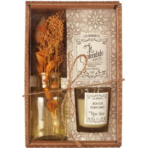 Dimensions• Bougie : Ø 5,5 x H 6,5 cm• Coffret : 22 x 16,3 x 6 cm• Vase : Ø 5,5 x 10 cmComposition• Bougie en cire de paraffine• Vase en verre• Coffret en carton et plastiqueDescription• Coffret comprenant une bougie parfumée + un vase garni de fleurs séchées• Très joli coffret de présentation• Bougie à 1 mèche• Durée 10 heures• Étiquette style apothicaire sur la bougie• Coloris marron : parfum ambre• Coloris vert clair : musc blanc• Coloris beige : parfum fleur de coton• Chaque coffret contient un ensemble de senteur et de coloris différents, parfait pour varier les plaisirs !Conseils de sécurité :• Ne pas laisser la bougie allumée la nuit et ne pas quitter la pièce lors de la combustion de la bougie• Brûler la bougie hors de la portée des enfants et des animaux domestiques• Ne pas faire brûler les bougies à proximité d'un quelconque objet susceptible de s'enflammer