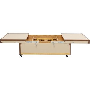 Cette table de salon qui fait également bar est une vraie pièce d'exception. Différents compartiments et porte-bouteilles ainsi qu'un plateau amovible se trouvent à l'intérieur du coffre. Son revêtement en simili tressé beige est facile d'entretien. Livrée avec les roulettes démontées.