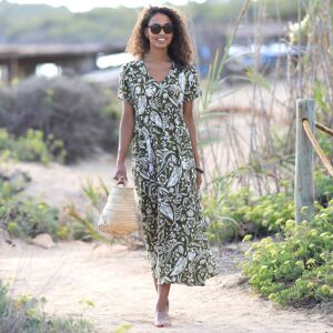Taille• Longueur 121 cm environComposition• Crépon 100% viscoseDescription• Crépon frais et léger, un bonheur à porter• Forme évasée qui flatte toutes les morphologies• Col V• Manches courtes• Pinces poitrine pour plus d'aisance• Découpe taille haute• 2 grands volants froncés à la base