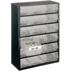 Bloc de rangement série 150 avec 36 tiroirs Structure métallique peinte (coloris anthracite). 36 Tiroirs transparents modèle A, maintenus par guides latéraux Points forts > Butée-arrêt sur tiroir pour éviter les chutes. > Perforations prévues pour fixation murale Dimensions > Tiroir A : H. 35 x L. 64 x P. 135 mm. > Hors tout bloc tiroir : H. 420 x L. 307 x P. 150 mm. > Poids :