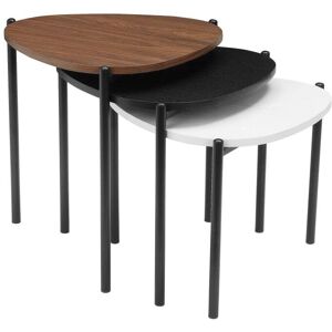 Présentation d'un ensemble de 3 tables basses. Ces tables peuvent être poussées les unes sous les autres pour gagner de la place. La forme du plateau est comme une feuille. Fabriqué en panneau de particules laminé, chaque plateau a une couleur différente : blanc, noir et aspect bois. Parfait pour les petits espaces de vie. Chaque table a 3 pieds en métal noir.