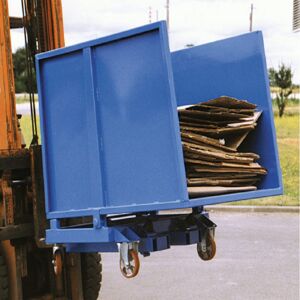 Benne basculante ouverte pour évacuation des produits plats. Capacité 1150 à 2000 Litres. Déclenchement automatique. Charge unique de 1200 kg. Cette benne est idéale pour stocker et vides des cartons. Empilage aisé par face ouverte. Caisse en tôle pliée 20/10ème avec renforts. Finition en peintur...