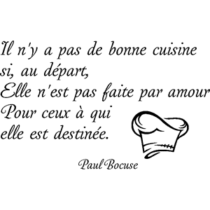 Des stickers cuisine pour votre déco ! Avec ce stickers pour la cuisine citation représentant un Sticker citation cuisine il n'y a pas de bonne cuisine - Paul Bocuse vous pourrez décorer les murs de votre cuisine de manière originale et facile! Grâce à ce sticker mural cuisine, vous allez pouvoir d