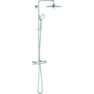 Grohe Euphoria système de douche 27296003 composé d'un bras de douche de 45 cm orientable horizontalement Thermostat en saillie avec fonction Aquadimmer permet de basculer entre la douche de tête Euphoria 260 (26 455) Pluie, SmartRain, Jet avec rotule Angle de rotation +/-15° Douchette à main Euphoria 110 Massage (27 221) 3 types de jets : Pluie, Massage, SmartRain Réglable en hauteur par élément coulissant Flexible de douche Silverflex 175 cm (28 388) Cartouche compacte TurboStat avec thermocouple à expansion Verrouillage de sécurité SafeStop à 38 °C Arrêt de température SafeStop Plus utilisable en option à 43 °C CoolTouch ne brûle pas sur les surfaces chaudes ProGrip avec structure moletée Modèle de pulvérisation DreamSpray Surface étoilée SprayDimmer pour une réduction continue du débit Variable de la console supérieure FastFixation Alimentation en eau interne séparée Système anticalcaire SpeedClean Twistfree pour empêcher le flexible de douche de se tordre Convient aux chauffe-eau instantanés à partir de 18 kW/h Débit minimum 7 l/min accessoire en option étagère EasyReach (26 362)