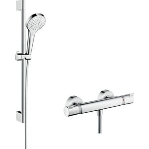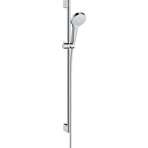 hansgrohe Croma Select S Ensemble de douche multi Numéro d'article 26560400 Type de jet: jet de massage, SoftRain, IntenseRain Changement de Select pratique Select bouton Select Taille de la pomme de douche: 110 mm pivotant côté douche contre la torsion gênante du tuyau de douche Angle d'inclinaison réglable de 90 °, le curseur pivote à gauche et à droite ainsi qu'en haut et en bas Débit maximum (à 3 bar): 16 l / min support mural en plastique chromé