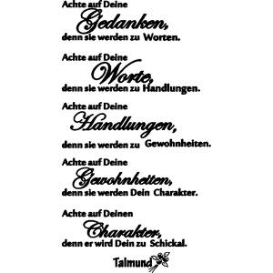 Des stickers muraux citations pour la déco ! Avec les stickers citation et ce Sticker "Achte auf deine gedanken" (Talmund), vous pourrez enfin décorer l'intérieur de votre cuisine à votre guise avec leur aide ! Votre rêve deviendra réalité, votre réussite dépend de vos éfforts, c'est pour ça que ce