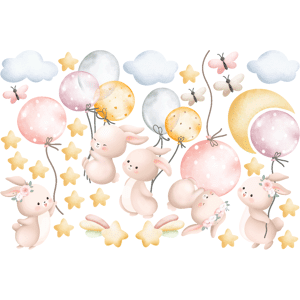 Des stickers animaux pour votre déco ! Avec les stickers muraux animaux multicolore et ce Stickers animaux lapins avec des ballons bleus, vous vous approprierez enfin votre intérieur ! Dimensions des stickers animaux : Ce sticker déco chambre enfant se compose de : 4 stickers lapins avec des ballon