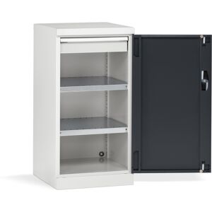 Armoire d'atelier métallique modèle Môle n°2 comprenant : > 2 tablettes galvanisées rainurées réglables en hauteur tous les 25 mm. Charge par tablette 100 kg. > 1 tiroir simple extension dim. Hors-tout L.398*P.449*H.100 mm (H. utile 85 mm), extension simple à 87% Charge par tiroir 50 kg. > Structure métallique monobloc Caractéristiques techniques > Peinture électrophorèse cuite au four. Coloris gris cl