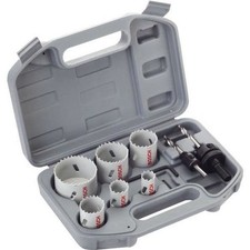 Coffret de scies trépans avec adaptateur Wood and Drywall et fpret de centrage 22 ; 25 ; 29 ; 35 ; 38 ; 44 ; 51 ; 68 x 15 mm Pour perceuses/visseuses rotatives, Pour perceuses / visseuses a percussion Perçage efficace de trous dans le bois et les cloisons seches Conception spéciale de la denture pour des coupes rapides. Fabriqué a partir d'une seule piece de métal pour la stabilité>
