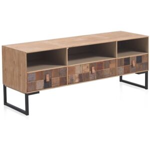 Ce meuble TV à 3 portes unies est fabriqué en bois de manguier massif de couleur naturelle, ce qui lui confère un aspect rustique et chaleureux. Les portes s'ouvrent à l'aide d'une articulation digitale et les charnières se ferment en douceur pour une manipulation sûre et confortable. Le meuble est doté d'une base en métal noir de 13 cm de haut qui lui confère une stabilité et une touche de modernité. Il ne nécessite pas de montage, il suffit de placer le pied de la base pour assurer la fermeté du meuble. Avec ce meuble TV, vous pouvez donner une touche d'élégance et de fonctionnalité à votre salon, en vous permettant d'organiser vos appareils électroniques et vos objets décoratifs de manière ordonnée et élégante.