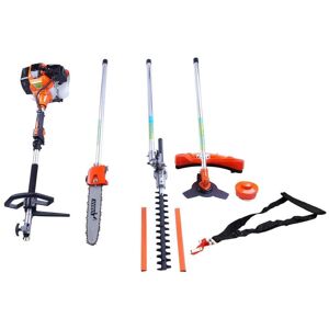 Superbe Kit 4 en 1 Tronçonneuse - Débroussailleuse - Taille haie à essence 52 cm³ avec une puissance maximale de 2.2Kw Varan Motors Cet objet vous deviendra vite indispensable. En effet, il combine en un seul produit tous les outils dont vous avez besoin pour entretenir vos haies, vos arbres, votre jardin, vos parterres et bien plus ! En outre, muni d'un moteur thermique puissant, il vous permettra de travailler bien plus rapidement et surtout sans câbles électriques à traîner derrière vous. Qui n'a pas encore eu la désagréable surprise de couper le câble d'alimentation en travaillant sur le contour de ses parterres?! N'hésitez plus! Améliorations apportées lors du dernier arrivage: Arbre de transmission renforcé (9 cannelures au lieu des 7 initiales) Tubes de transmission renforcés (plus épais) Poignée plus large Autre modification: couleur orange Description technique du produit : Moteur : 1 cylindre, 2T, refroidissement à air. Cylindrée : 52 cm³. Puissance : 3,0 cv/2.2 Kw. Guide tronçonneuse : 30 cm / Coupe: +-27cm / Longueur totale : 2m07. Taille-Haie : longeur de lame de 430 mm / Longeur totale +- 2m30 La lame du taille-haie est réglable sous tous les angles: approprié pour la taille horizontale et verticale. Espace entre dents: 23mm Débroussailleuse avec double fils de coupe (Diam:2,4 mm / Rayon max de coupe 46cm) et lame de fauchage à 3 dents (Diam: 25cm) Longueur totale : +- 1m80. Carburant : mélange essence et huile 2T (4%). Volume réservoir 550ml. Bouton d'arrét d'urgence. Dispositif de démarrage facile. Poids moyen à l'usage: 6,5 kg Colisage: 1 cartons de 108x29x29cm Poids total du carton: 14,56Kg Accessoires fournis : Récipient pour le mélange du carburant. Chaîne, guide, protège lames de taille haie. Fils nylon et lame 3-dents. Harnais. Outils pour l'assemblage. Infos: Cet article est neuf et livré dans l’emballage d’origine. Le manuel en français pourra être téléchargé via le lien figurant sur votre facture. Garantie: 2 ans pour une utilisation particulier, 6 mois pour une utilisation professionnelle ou assimilée. Cet objet fonctionne au mélange 2temps, si vous l'utilisez sans adjonction d'huile, il sera irrémédiablement détruit. Les pannes suite à une mauvaise utilisation ou omission d'ajout d'huile, ne sont pas prises en charge par la garantie.