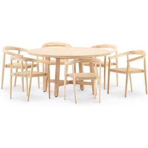 La collection Modena vise à combiner le monde intérieur et extérieur sous un même prisme. Elle transpose le design des collections d'intérieur à l'extérieur en jouant avec des matériaux très résistants aux conditions extérieures. Dans ce cas, le bois de teck et le rotin synthétique tressé à la main sont responsables de cette contribution.Ensemble de salle à manger rond 6 placesTable de jardin ronde en bois d'acacia clair6 chaises de jardin empilables avec accoudoirs en teck et rotin synthétiqueTable : 150Dx75cm, Chaise : 45x58x85cm.