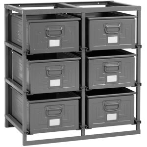 Rack de stockage 6 postes équipé avec : > 6 caisses métalliques finition vernie grand volume 85 litres > Socle métallique Dimensions > Hors tout rack : H. 1180 x L. 1125 x P. 660 mm. > Caisse métallique : H. 300 x L. 450 x P. 630 mm. > Poids total : 138 kg. Charge maxi : Maximum de 3 racks de stockage superposables > Charge maxi de 1200 kg par rack et 200 kg par box