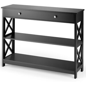 Attributs:Grande capacité de stockage multi dimensions : En plus du tiroir ultra large pour vos affaires personnels, les 2 étagères en bas vous permettent de ranger une variété d’affaires, y permettant un accès immédiat. Le haut du meuble sert aussi de rayon, prêt à y abriter les clés, la monnaie, etc.Meuble de qualité prêt pour tous les besoins : Fabriquées en bois aggloméré de qualité prémium, les planches d’une épaisseur de 15 mm ont subi des traitements antichocs. Elles sont résistantes à l’usure et peuvent supporter jusqu’à 95 kg. Les supports en forme de X augmentent la stabilité.Une attention aux détails qui facilite votre quotidien : La planche formant l’étage la plus basse protège vos affaires du sol. Non seulement sont les affaires stockées plus propres, mais c’est aussi plus pratique quand vous nettoyez par terre. Les pieds avec patins de protection intégrés protègent davantage le sol.Design industriel compatible avec tous styles : Si la table de console au forme sobre séduit au premier coup d’œil, sa couleur gris clair fond discrètement dans tous les décors. Les boutons en métal témoignent de la qualité de vos décors intérieures. Au salon, à la salle à manger ou dans la chambre, ce meuble saura trouver sa place. Caractéristiques :Espace de rangement spacieuse multi dimensionsConstruit en bois MDF résistant épais de 15 mmStructure en X stabilisant supportant jusqu'à 95 kgPeut servir de console, de bout de canapé, de table d'entréeConvient aux différentes pièces de la maisonDesign moderne avec boutons en métalPieds anti-rayure anti dérapantSimple à monter selon instructionsImpeccablement emballé pour une livraison rapideSpécifications :Couleurs : blanc/gris/brunMatériaux : MDF (planche aggloméré) + panneaux de particulesDimensions : 99,8 x 29,8 x 80,2 cm (L x l x H)Poids net : 18,8 kgCapacité de charge du plateau : 50 kgCapacité de charge du tiroir : 5 kgCapacité de charge de chaque étagère : 20 kgÉtagères : 94 x 29 cm (L x l)Hauteur entre les étagères : 26,5, 27,5 cmTiroirs : 93 x 24 x 8 cm (L x l x H)Livraison :1 x console1 x mode d'emploi