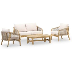 Ensemble composé de 2 fauteuils, 1 canapé 3 places, 1 canapé 2 places, 1 table avec structure en bois d'acacia FSC et coussins déhoussables couleur écru avec velcro pour une fixation parfaite.La collection Cannes wood rappelle le design classique nord-américain : de larges lattes de bois et des structures solides et cohérentes tout en conservant l'ergonomie comme base de la gamme.Fauteuil : 85,5x77x78cm, Canapé 2 : 141x77x78cm, Canapé 3 : 204,5x77x78cm, Table : 120x59x37cm.