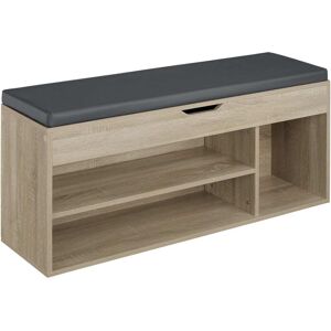 Ce banc à chaussures tendance est l'endroit idéal pour ranger vos chaussures préférées, toujours à portée de main. Asseyez-vous confortablement sur son coussin rembourré afin d'enfiler tranquillement vos chaussures. La couleur discrète de ce meuble robuste s'accorde parfaitement avec presque tous les intérieurs. Écharpes, gants, bonnets et autres accessoires trouveront leur place dans le compartiment rabattable du haut. Le banc à chaussures polyvalent de tectake se montre parfait pour équiper l'entrée de votre maison. Caractéristiques Techniques: Dimensions totales (lxPxH) : env. 104 x 30 x 49 cmDimensions intérieures des compartiments horizontaux (lxPxH) : env. 72 x 29 x 15 cmDimensions intérieures du compartiment vertical (lxPxH) : env. 27,5 x 29 x 31,5 cmDimensions intérieures du compartiment rabattable (lxPxH) : env. 101 x 26,5 x 8,5 cmÉpaisseur du coussin d'assise : env. 4 cmÉpaisseur du panneau MDF : environ 1,5 cmCapacité de charge : 120 kgPoids : env. 18,5 kgMatériaux : panneau MDF avec revêtement de mélamine, 100 % polyuréthane