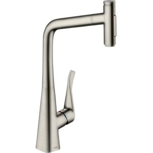 hansgrohe Metris Select 801 mélangeur de cuisine trou 73818340 composé de : mitigeur de cuisine à 6 801 élément de contrôle boîte à tuyau Zone de confort 200 Plage de pivotement 110/150° élément de contrôle de positionnement flexible 2x trous taraudés de 35 mm requis Jet laminaire et de douche Douchette verrouillable Changement de jet en appuyant sur un bouton et réarmement automatique du jet en fermant le raccord bouton Select pour allumer et éteindre le jet d'eau Support de douche magnétique MagFit Flexible de douche Connect Taille de raccordement DN 15 débit 8 l/min système de mélange en céramique Type de raccordement flexibles de raccordement G 3/8 Clapet anti-retour intégré adapté pour chauffe-eau SBox pour un acheminement protégé des flexibles dans l'armoire de base Longueur d'extension jusqu'à 76 cm