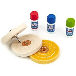 Ce kit de polissage HBM en 7 pièces convient aux professionnels comme aux amateurs. Livré avec trois pâtes : la bleue pour le pré-polissage ou les défauts légers (par ex. rayures de vernis) à utiliser avec le disque jaune (le plus abrasif) ; la rouge pour obtenir une brillance moyenne avec un des deux disques blancs ; puis la verte pour la haute brillance ou les matériaux plus durs.