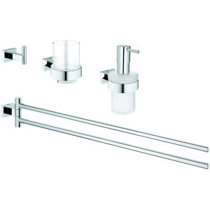 Grohe Essentials Cube 4 dans 2000 Salle de bains set Numéro d'article : 40847001 chrome avec GROHE StarLight : surface chromée durable et facile à nettoyer pour montage mural avec fermeture dissimulée, pour Schrauben composé de: distributeur de savon (40756001) Verre avec Halter (40755001) Porte-serviettes (40624001) Crochet pour peignoir (40511001) distributeur de savon : Portée: conteneur, tête de pompe, support mural, fixation Mug en verre satiné Dimensions (LxHxP): 74 x 157 x 126 mm Verre avec Halter : Portée: verre, support mural, fixation Dimensions (LxHxP): 72 x 95 x 107 mm Porte-serviettes: 2 bras pivotant Profondeur: 439 mm Crochet peignoir: Profondeur: 60 mm