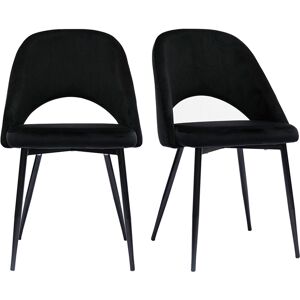 Avec leur look délicieusement fifties, les chaises COSETTE apporteront beaucoup de charme à votre décoration ! Ces chaises à l'inspiration vintage et aux lignes fluides se distinguent par leur dossier haut et courbé (L37 x H38.5 cm) qui permet un excellent maintien du dos. Avec leur coque généreusement rembourrée (densité de la mousse 25 kg/m3), ces jolies chaises de cuisine et salle à manger offrent un très bon confort d'assise. Ces assises au charme subtilement rétro sont synonymes de convivialité et de partage. Leur revêtement en tissu velours (100% polyester) se décline en noir, une teinte sobre et élégante par excellence. Les pieds fuselés en métal noir apportent de la légèreté à la silhouette et s'accordent aisément avec tous les styles de tables à manger. Ces chaises noires donneront le ton d'une atmosphère chic et vintage. Chaises livrées par lot de 2. Livrées prêtes à monter.