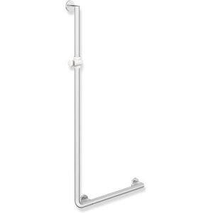 Hewi poignée d'angle System 900 avec support de douche 900.33.200XA98 Tige Inox mate disposé verticalement et horizontalement Barres reliées à angle droit avec rosaces de fixation et support de douche Poteaux Ø 32 mm 88 mm de profondeur Épaisseur du tuyau 2 mm Rosetten Ø 70 mm adapté pour Douchettes différent Fabricants Le support de douche peut être incliné en continu et ajusté en hauteur après avoir appuyé sur un gros bouton poussoir Le support conique sur le support de douche facilite la suspension de la douchette avec un matériau de fixation sans corrosion