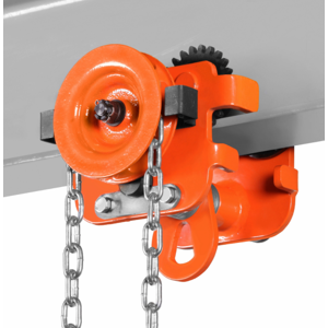 Chariot translation par chaîne sans fin, pour tout type de poutre, droit ou incliné. Hauteur de manœuvre utile standard : 3 m. Largeur réglable par bagues. Galets en acier tourné, roulements à billes sans entretien. Support anti-casse galets pour une sécurité optimale.