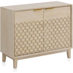 Commode avec une structure en panneaux plaqués chêne couleur vanille et 2 portes décorées de gravures dorées et de charnières soft-close. Les poignées sont en métal doré, l'intérieur comporte une étagère fixe et les pieds sont en bois. Le meuble est équipé d'un mécanisme de sécurité anti-basculement par ancrage au mur.