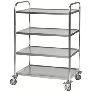 Chariot en inox à 4 plateaux de qualité 18/0. Idéal pour les milieux agro-alimentaire, chimiques et hospitaliers. Caractéristiques techniques du chariot : Charge : 100 kg. Charge par étagère : 25 kg. Dimensions extérieures Lxlxh : 910 x 590 x 1260 mm. 4 roues pivotantes dont 2 avec freins, de Ø ...
