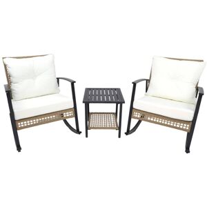 - SPÉCIFICATIONS : Dimensions des chaises : H 88 x L 66,5 x P 90 cm - Table : H 47,5 x L 45 x P 45 cm - Matériau : Acier, Polyrattan, Éponge, Polyester - Couleur : Noir, Blanc, Marron - Poids max supporté (chaises) : 120 kg - Table : 30 kg - Set : Oui, 3 pcs - Code : RE7182- ENSEMBLE DE CHAISES À BASCULE ET TABLE : Un ensemble de chaises et table d'extérieur idéal pour décorer le jardin, le balcon ou la véranda, créant un coin détente confortable pour profiter de la belle saison.- MATÉRIAUX DURABLES, CONFORT MAXIMAL : L'ensemble de 2 chaises à bascule et table est fabriqué en acier et plastique effet rotin, des matériaux de qualité et durables. Les chaises sont dotées de coussins d'assise et de dossier en éponge, déhoussables.- À MONTER, INSTRUCTIONS INCLUSES : L'ensemble de chaises et table d'extérieur est expédié en kit. L'assemblage est simple en suivant les instructions et en utilisant le kit inclus, permettant de monter les chaises et la table en quelques étapes.- EMBALLAGE SOLIDE : L'ensemble d'extérieur est expédié dans un carton robuste à 5 couches, avec chaque pièce emballée dans du papier bulle et du plastique. Dans le colis, vous trouverez également le kit complet dans un sac en plastique.